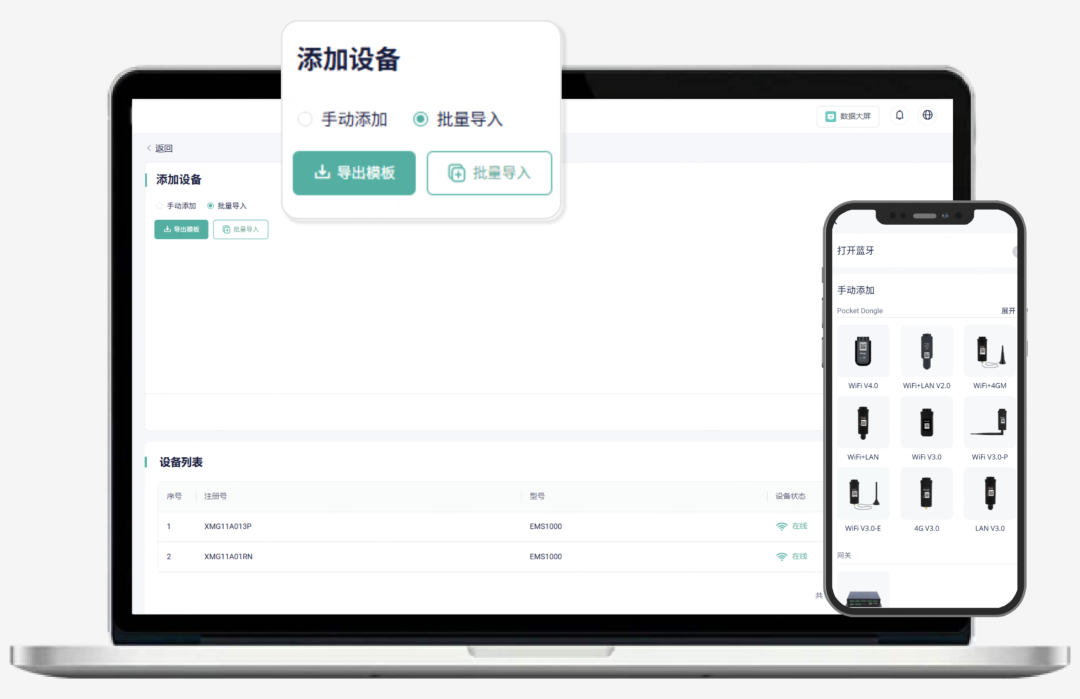 绑定核心设备:通过Dongle/EMS轻松绑定您的储能设备、逆变器、充电桩等核心能源设备,并支持大型电站的批量导入。